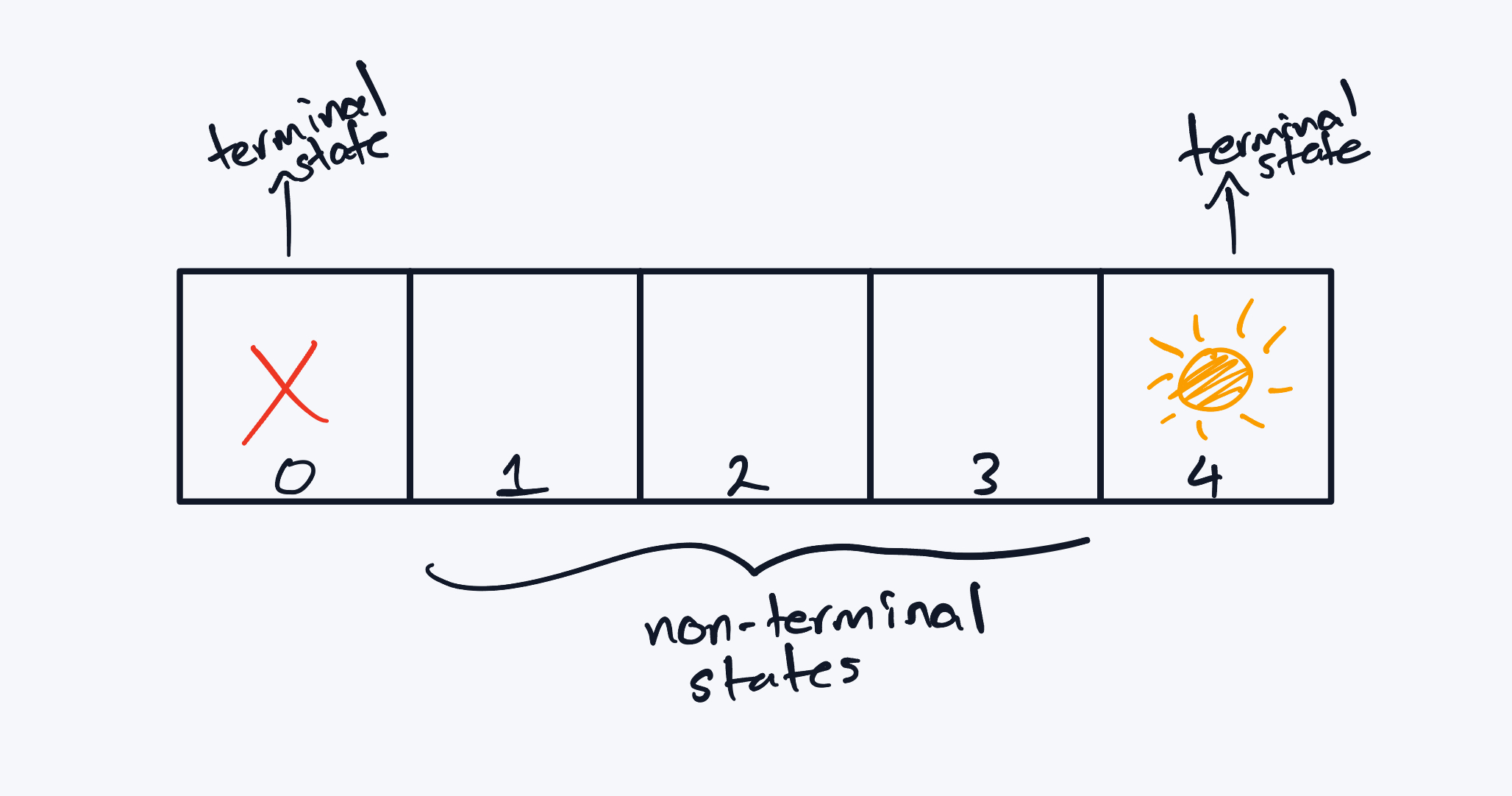 - State 4 is a terminal treasure (absorbing, positive reward)